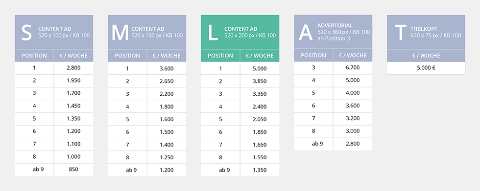 Mit dem Content Ad L können Sie dem Leser zwischen den redaktionellen Inhalten Ihre Botschaft nahebringen. Werbeplatzierungen in diesem Bannerformat werden auch in der Mobile-Ansicht optimal dargestellt.