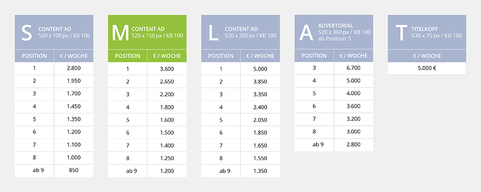 Mit einem Content Ad M können Sie dem Leser zwischen den redaktionellen Inhalten Ihre Botschaft nahebringen. Werbeplatzierungen in diesem Bannerformat werden auch in der Mobile-Ansicht optimal dargestellt.