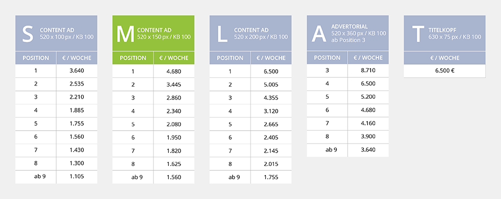 Mit einem Content Ad M können Sie dem Leser zwischen den redaktionellen Inhalten Ihre Botschaft nahebringen. Werbeplatzierungen in diesem Bannerformat werden auch in der Mobile-Ansicht optimal dargestellt.