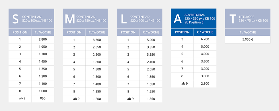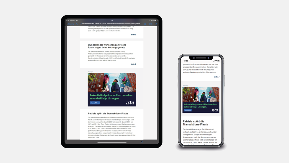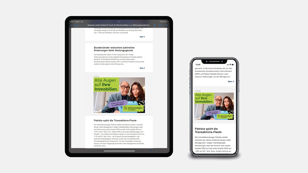 Mit einem Advertorial in unserem Newsletter haben Sie die Möglichkeit Ihre Botschaft in Form eines Banners im Format 520x360 px publik zu machen. Ihre Werbeplatzierung unterscheidet sich aufgrund der Gestaltung von den Redaktionsinhalten, ist jedoch inmitten dieser eingebettet. Buchbar sind die Positionen ab Platz 3.Hier finden Sie Beispiele und detaillierte Infos von erfolgreich umgesetzten Newsletter-Advertorials, die Ihnen als Inspiration dienen können.